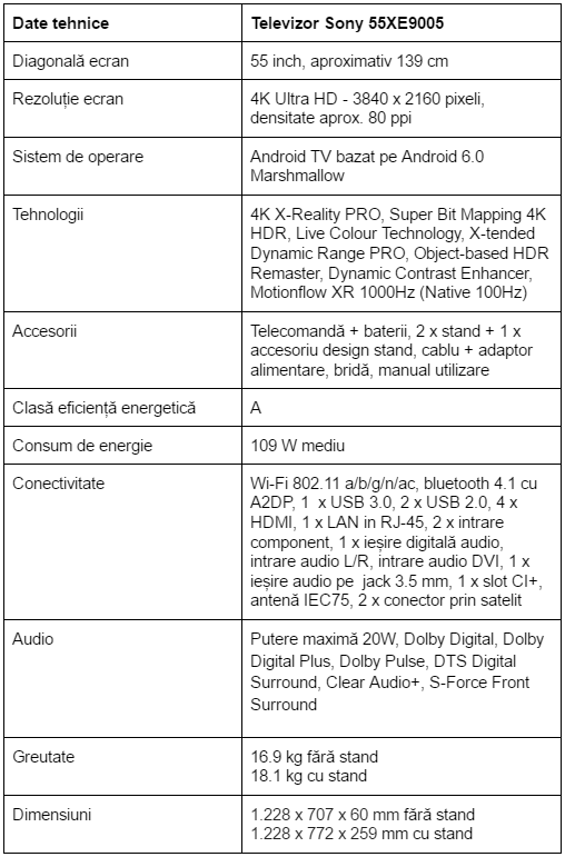 Sony 55XE9005 – 7.999 de lei pe eMAG. La data publicării review-ului eMAG oferă cadou un Soundbar Sony HTRT3, cu putere de 600W și conectivitate Bluetooth și NFC. Valoarea acestuia este de 1.050 de lei.