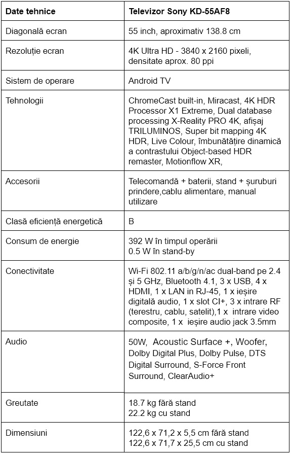 Ca și în cazul altor smart TV-uri, nici acum nu avem prea multe detalii legate de ansamblul hardware. Nu știm ce procesor stă la baza lui Sony KD-55AF8 (nu cel de imagine, acela este X1 Extreme) și nici câtă memorie RAM este disponibilă. Doar despre spațiul de stocare știm că este de 16 GB, dintre care disponibil utilizatorului rămân doar circa 8 GB.