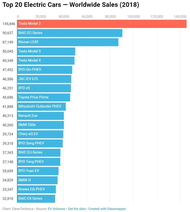 Dacă Tesla are în top 5 cele mai vândute maşini electrice 3 modele, pe primele 20 de poziţii mai regăsim şi alte nume cunoscute precum Nissan LEAF, Toyota Prius Prime, Renault Zoe sau BMW i3. Interesant este că avem o listă numeroasă de maşini chinezeşti din partea unor branduri necunoscute în Europa: JAC, BYD sau BAIC fiind câteva dintre acestea.