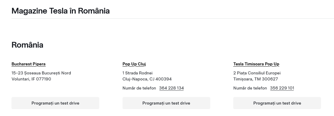 Tesla are în prezent în România un showroom în Bucureşti şi două pop-up store-uri în Timişoare şi Cluj-Napoca (foarte probabil acestea vor fi închise după deschiderea showroom-urilor).