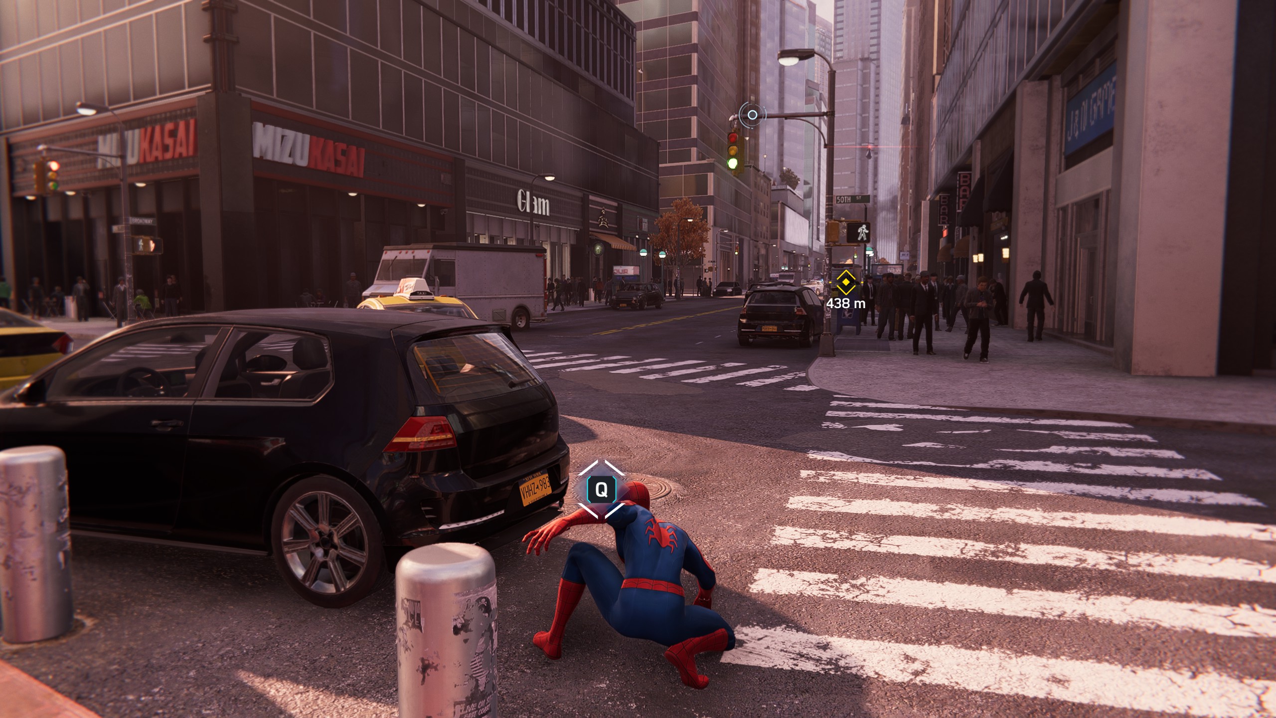 Intervenția Ray Tracing este poate cel mai clar reprezentată în setul de mai sus. Se observă cum sunt reflectate detaliat elementele din jurul mașinii de lângă Spiderman, dar și reflexii pe geamurile tuturor clădirilor, cu precădere pe cele din apropiere. DLSS plusează și face ca totul să fie mai bine conturat.