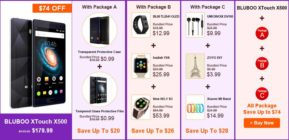 - Bluboo XTouch – preţ standard 179 dolari şi 3 pachete cu accesorii;