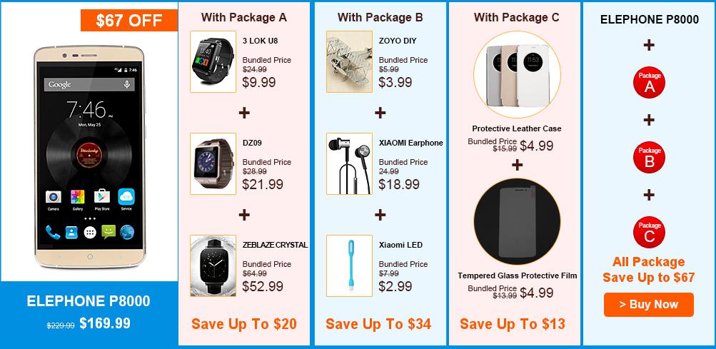 - Elephone P8000 – preţ standard 169 dolari şi 3 pachete cu accesorii;