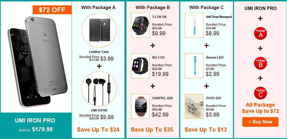 - UMi Iron PRO – preţ standard 179 dolari şi 3 pachete cu accesorii;