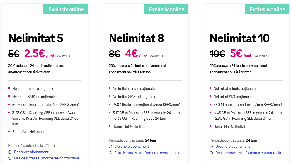 - abonamentul Nelimitat 5 costă 2.5 euro lună timp de 24 de luni şi vine cu nelimitat minute şi SMS-uri naţionale, nelimitat internet pe mobil, 3.23 GB în roaming SEE şi 50 de minute internaţionale în SEE şi Zona 1;