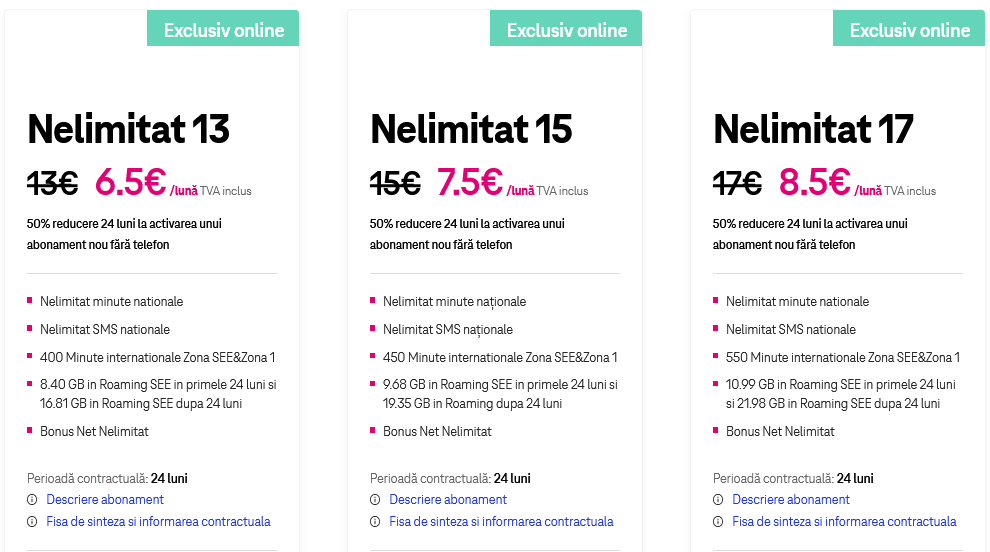 - abonamentul Nelimitat 15 costă 7.5 euro lună timp de 24 de luni şi vine cu nelimitat minute şi SMS-uri naţionale, nelimitat internet pe mobil, 9.68 GB în roaming SEE şi 450 de minute internaţionale în SEE şi Zona 1;
