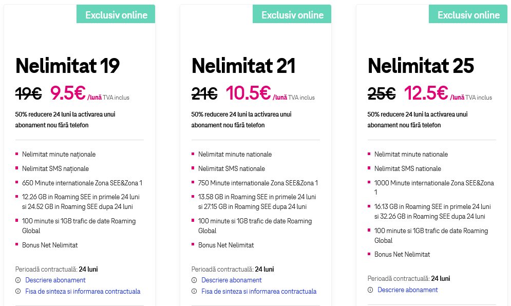 - abonamentul Nelimitat 19 costă 9.5 euro lună timp de 24 de luni şi vine cu nelimitat minute şi SMS-uri naţionale, nelimitat internet pe mobil, 12.26 GB în roaming SEE şi 650 de minute internaţionale în SEE şi Zona 1 şi roaming global 100 de minute şi 1 GB internet pe mobil;