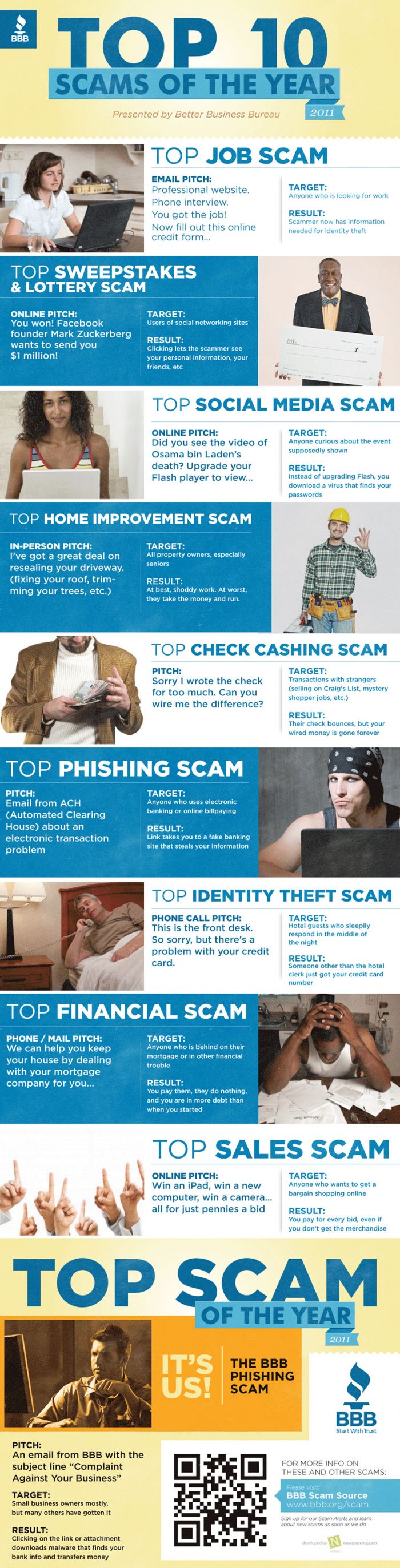 Cei de la Better Business Bureau au realizat un infografic în care prezintă cele mai importante 10 înşelăciuni care s-au realizat în 2011. Ordinea acestora a fost aleasă în funcţie de numărul de plângeri şi de evenimentele exploatate de escroci.