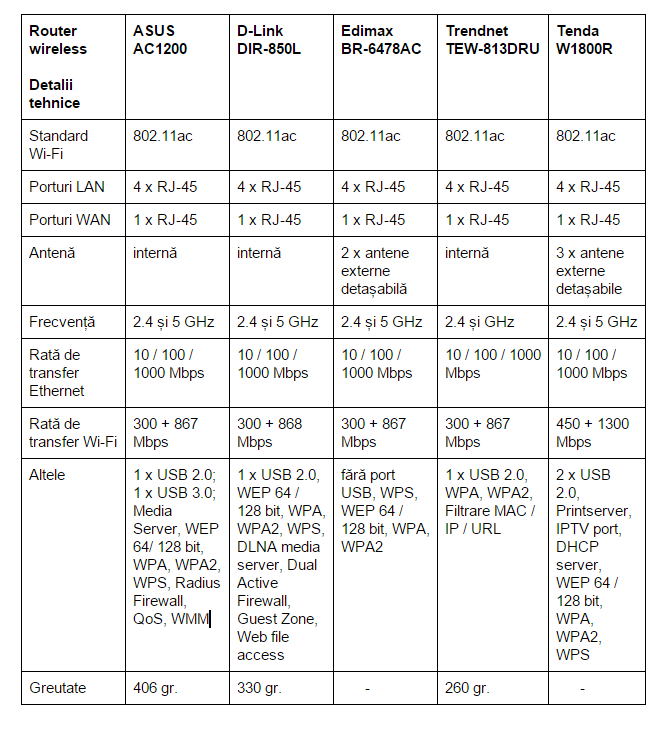 Toate specificațiile  celor 5 routere wireless sunt listate în tabel.