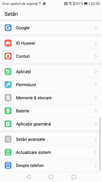 Setările sunt grupate pe capitole-cheie: Conectivitate ( Setări cartelă duală, Wi-Fi, Bluetooth, Date Mobile și Mai multe), Ecran și sunet ( Stil ecran de pornire, Afișare, Sunet, Notificări și bară de stare, Tastă de navigare), Securitate și conturi ( ID amprentă, Blocare ecran și Parole, Siguranță și confidențialitate, Asistență inteligență, Nu deranjați, Google, ID Huawei și Conturi), Aplicații, memorie și baterie ( Aplicații, Permisiuni, Memorie și stocare, Baterie, Aplicație geamănă), Setări avansate ( Dată și ora, Limbă și tastatură, Utilizatori, Mod simplu, Imprimare, Accesibilitate, Transmisii de date, Copie de rezervă și resetare), Actualizare sistem și Despre telefon.