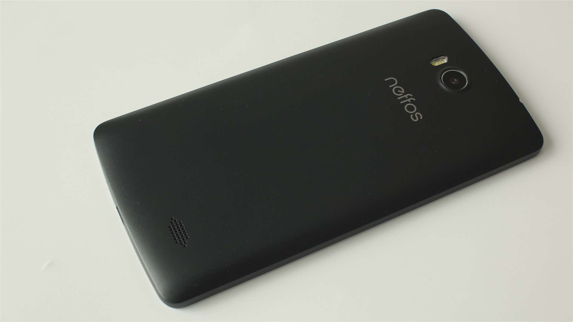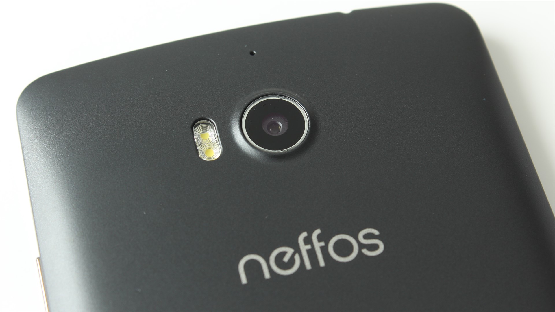 Pe partea din spate avem trecută denumirea gamei Neffos, imediat sub camera principală de 13 Megapixeli. Senzorul acesteia și lentilele aferente nu ies foarte tare din linia generală a telefonului, însă, odată așezt pe spate, terminalul se va sprijini pe marginea de plastic a camerei. Totuși, nu sunt șanse prea mari să zgârii sticla.