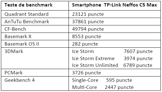 TP-Link Neffos C5 Max a trecut prin câteva teste de benchmark, iar rezultatele sunt trecute mai jos, în tabelul următor: