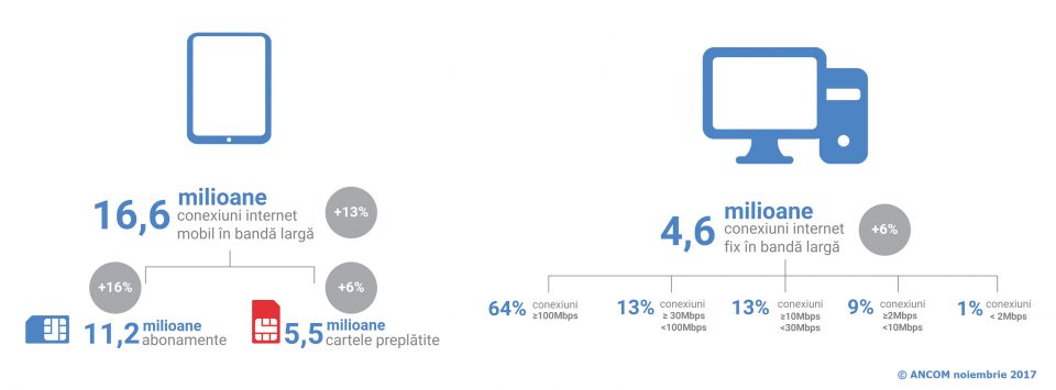 - 6 milioane de conexiuni la internet fix în bandă largă (3.3 milioane în mediul urban şi 1.3 milioane în mediul rural);