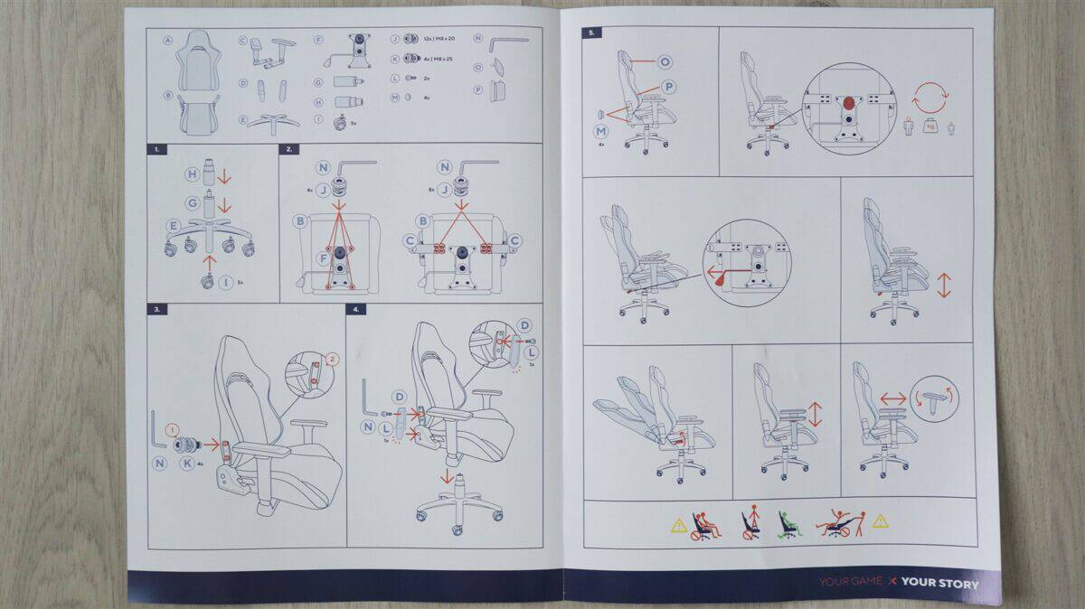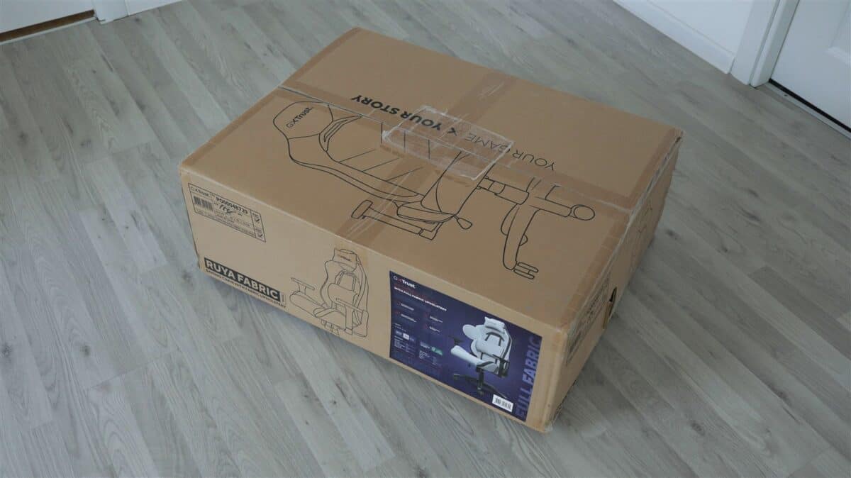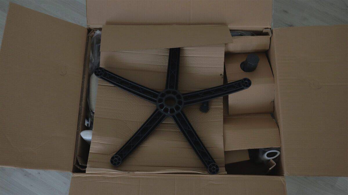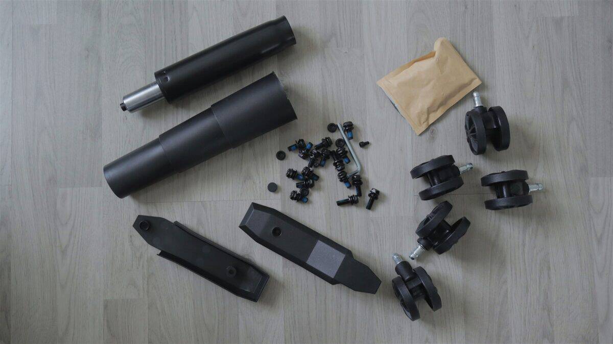 Scaunul vine într-o cutie în care fiecare componentă este bine protejată, ambalată în folie și cu carton între fiecare. Avem șezutul, spătarul, cele două cotiere, perniță pentru cap (tetieră), perniță pentru zona lombară, elementul pe care se montează cele cinci roți, elementul care controlează reglajul pe înălțime al scaunului, pistonul, element care acoperă pistonul, cele cinci roți, șuruburi, elemente care acoperă zona ce leagă șezutul de spătar, câteva capace care acoperă anumite orificii, cheie tip imbus și un pliant cu rol de ghid de asamblare.