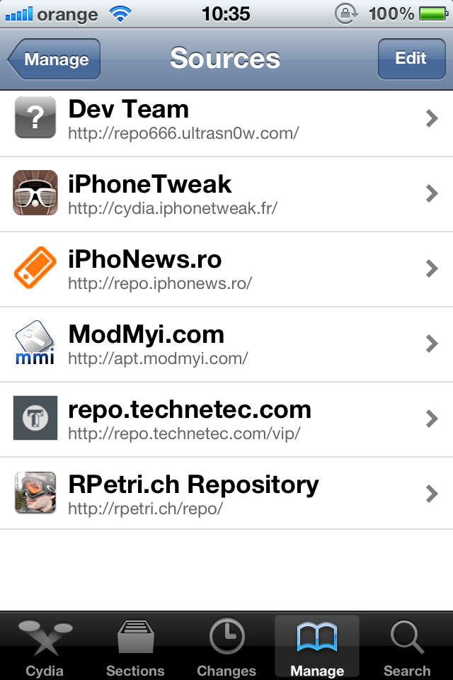 Odata cu Cydia, vin instalate 5 surse (numite repo-uri) de unde practic, se „hraneste” Cydia. Fiecare repo contine aplicatii, tweak-uri si alte lucruri pe care celelalte repo-uri nu le au. De aceea cu cat avem mai multe repo-uri instalate, cu atat putem gasi mai multe modificari si imbunatatiri pentru iPhone, iPad sau iPod Touch-ul vostru.