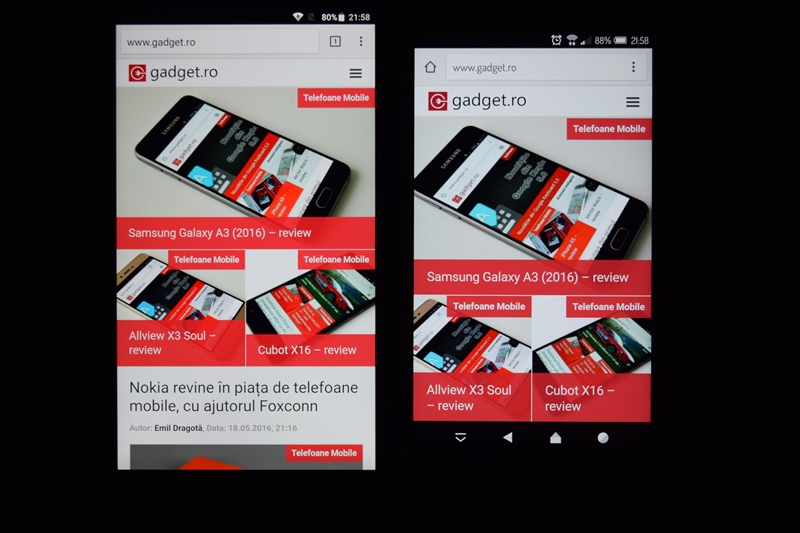 Sharp ştie să facă display-uri de foarte bună calitate, chiar dacă acestea sunt unele mid-range precum cel în cauză. Ecranul arată excelent, cu unghiuri de vizualizare largi, culori redate fidel cu cele naturale, lizibilitate decentă chiar şi în condiţii de lumină puternică şi ca o notă de sinceritate aş putea spune că este mai viu decât cel existent pe HTC One M9-ul personal (acesta parcă are o oarecare tentă gălbuie la redarea albului pur).
