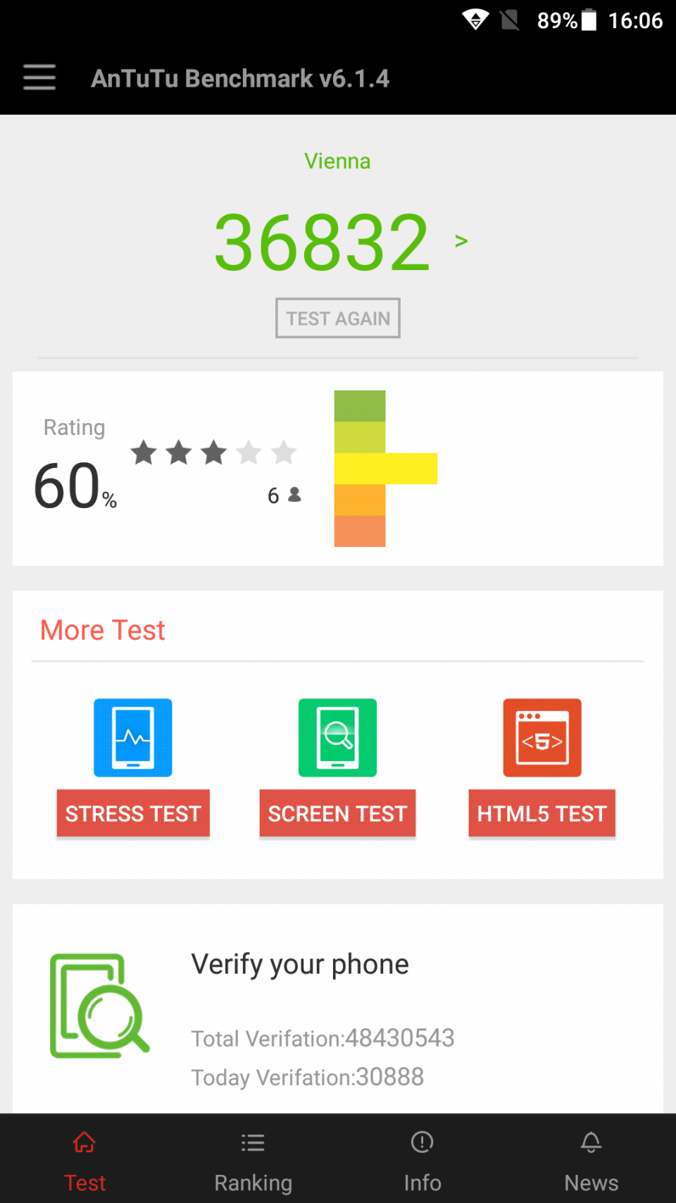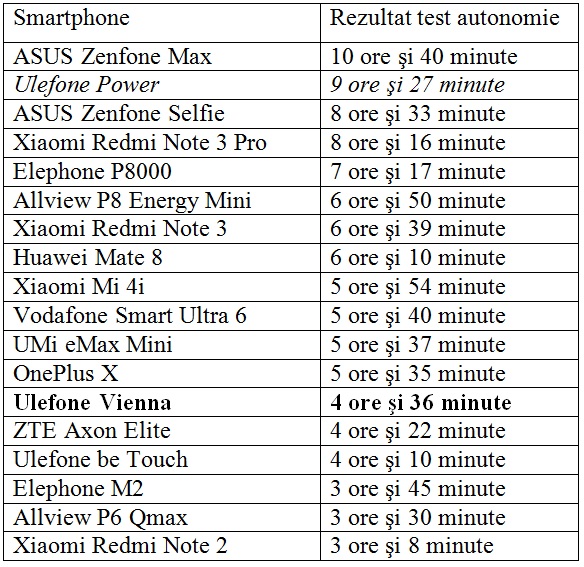 În testul nostru standard (luminozitate 100%, redare continuă a playlist-ului unboxing de pe canalul nostru de youtube de la 100% la 5% şi conexiune Wi-Fi la internet) Ulefone Vienna a obţinut un rezultat de 4 ore şi 36 de minute, adică undeva în a doua jumătate a clasamentului.