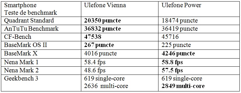Am realizat câteva teste de benchmark, iar rezultatele le-am pus în paralel cu cele obţinute pe Ulefone Power (din punct de vedere hardware, cele două terminale sunt similare).