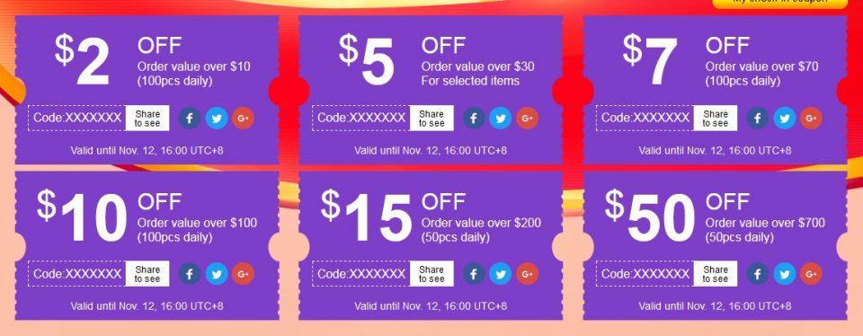 - cupoane cu reduceri pentru diverse categorii dacă acestea au fost distribuite pe diverse reţele de socializare (Codul 06GEEKBUY vă oferă un discount de 15 dolari la orice comandă mai mare de 200 dolari);