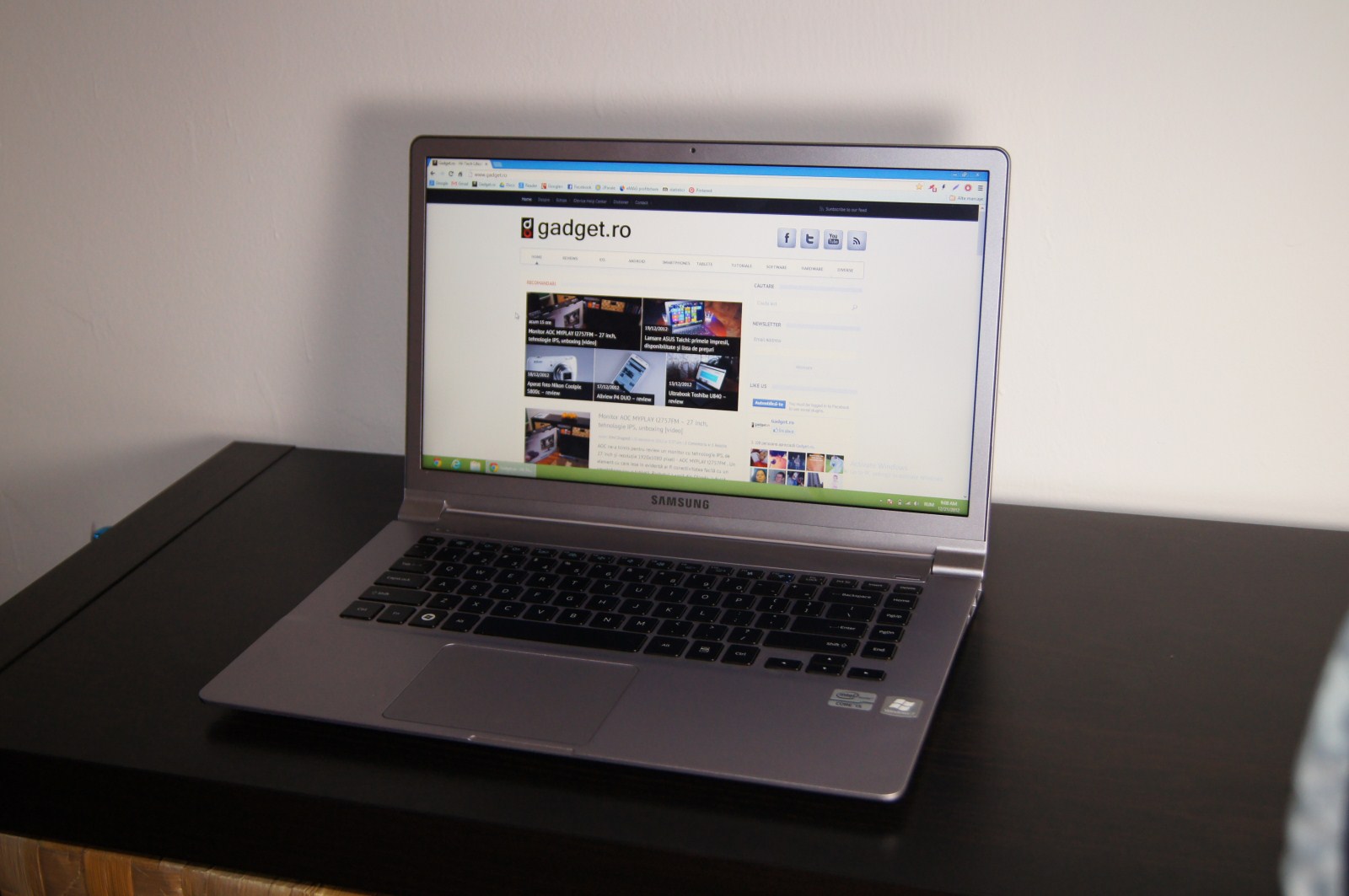 15.6 inch și rezoluțue 1600×900 pixeli, SuperBright. Samsung New Series 9 mi-a adus cel mai luminos display pe care l-am testat pe anul în curs și mi-au trecut prin mână peste 20 – 30 de portabile, majoritatea situate în segmentul de top și prețul lor cred că doar de 2 – 3 ori să fi coborât sub 3.000 de lei. Se vede foarte bine. Știu că atunci când a fost lansat se vorbea de tehnologia Samsung MaxScreen astfel încât să primești un notebook premium de 15 inch la dimensiunile unuia de 14 inch.