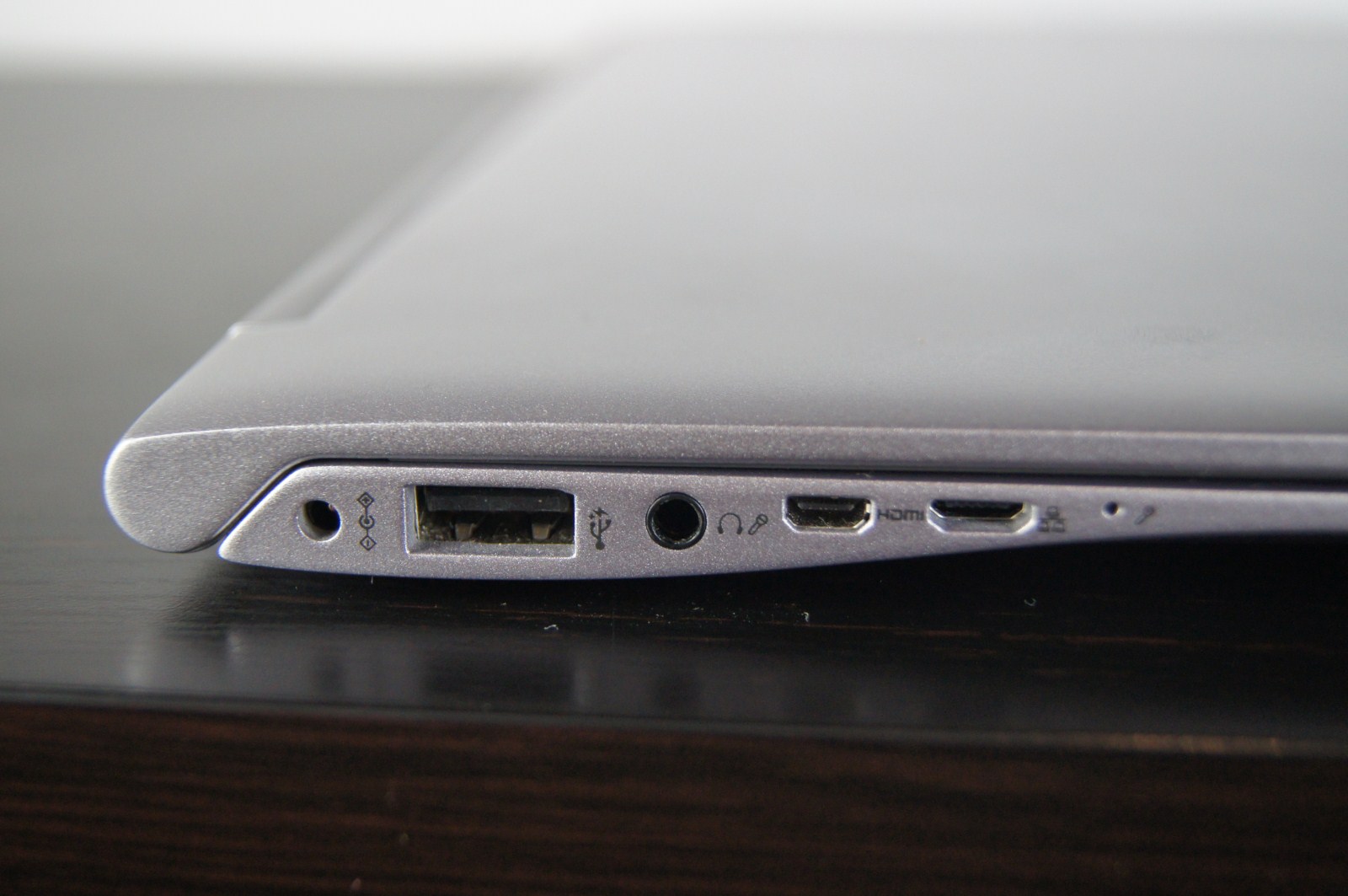 Include Wi-Fi în toate standardele: a/b/g/n, bluetooth de ultimă generație, compatibil cu WiDi. În lateral dreapta dați de 2 x USB 3.0 și un port pe care se poate conecta un dongle cu mufă RJ45. În stânga regăsiți un alt port USB de tip 2.0, jack pentru încărcător și de 3.5 mm pentru un sistem audio distinct sau căști. Se adaug un port microHDMI și altul prin intermediul căruia se poate opta pentru un dongle VGA.