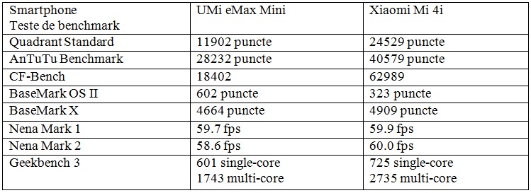 Am rulat şi câteva aplicaţii de benchmark, iar în tabelul de mai jos le-am pus comparativ cu cele obţinute pe Xiaomi Mi 4i.