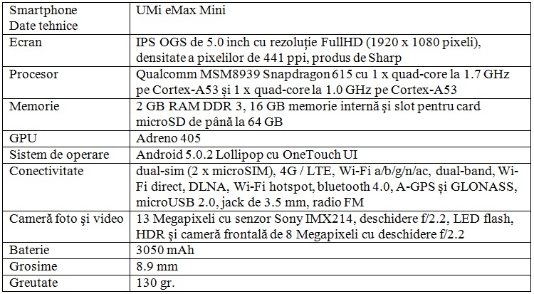 UMi eMax Mini este un telefon simplu, dar plăcut. Este primul device al producătorului chinez UMi ce utilizează un procesor Qualcomm Snapdragon. Mulţi spun că acest smartphone este defapt TCL 3S M3G rebranduit şi cu câţiva dolari mai ieftin. Am comparat cele două device-uri şi aş putea să spun că sunt identice din toate punctele de vedere cu excepţia a două elemente: TCL 3S M3G dispune suplimentar de cititor pentru amprentă oculară şi ştie 4G TDD. Diferenţa de preţ dintre cele două este de 10 dolari, probabil chiar din cauza celor două avantaje.