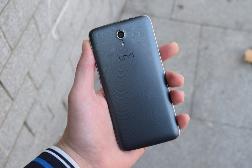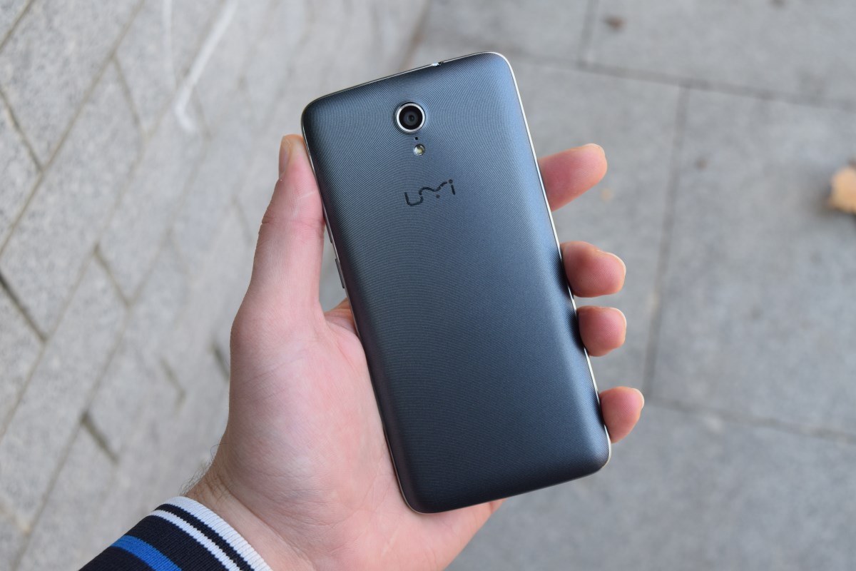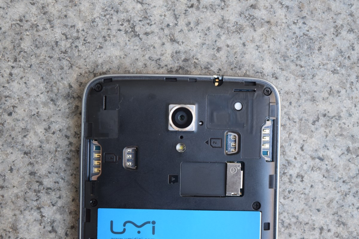La baza telefonul regăsim cele 3 taste capacitive, însă tastele Back şi Options se activează doar la apăsarea butonul Home (cel central). Tot în zona ecranului există camera frontală de 8 megapixeli şi senzorii de lumină şi proximitate. Pe spate avem camera foto de 13 megapixeli, flash LED-ul, logo-ul UMi şi un microfon. Capacul este detaşabil oferindu-se astfel acces la baterie, slotul microSD şi cele două sloturi microSIM. De menţionat că bateria nu poate fi înlăturată.