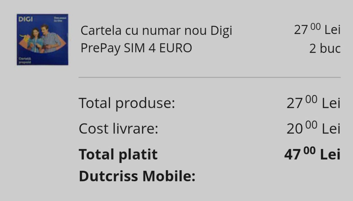 În cadrul acestui articol am primit mai multe mesaje din partea voastră în care ne spuneaţi că se pot cumpăra cartele prepay Digi Mobil cu 4 euro credit şi de pe eMAG Marketplace la un cost de 13.50 lei + transport (12.99 lei cu livrare la easybox sau 20 lei cu livrare prin curier acasă).