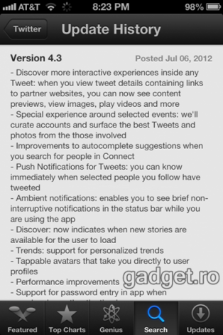 Dupa cum ne asteptam cu totii, se pare ca echipa dezvoltatorilor de la Twitter au lansat in App Store un nou update pentru clientul oficial Twitter pentru iOS. Acest update include cateva noutati pe care vi le-am prezentat intr-un articol precedent insa le voi repeta mai jos: