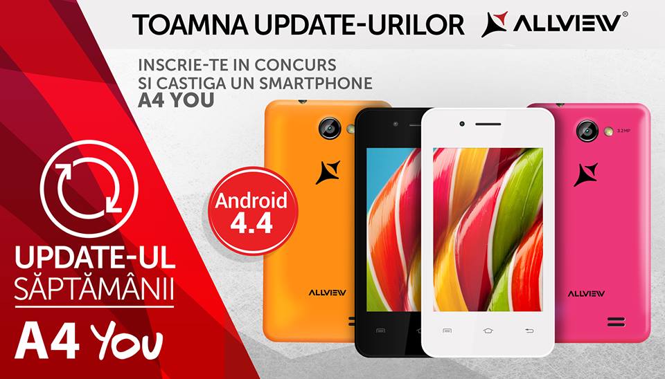Braşovenii de la Allview continuă campania “Update-ul săptămânii” pentru smartphone-ul Allview A4 You. Astfel, începând de astăzi toţi deţinătorii acestui device pot intra pe site-ul companiei de unde pot afla cum să instaleze Android 4.4 Kitkat pe Allview A4 You. Conform informaţiilor regăsite pe site, există două modalităţi de update. Mai multe detalii găsiţi aici.