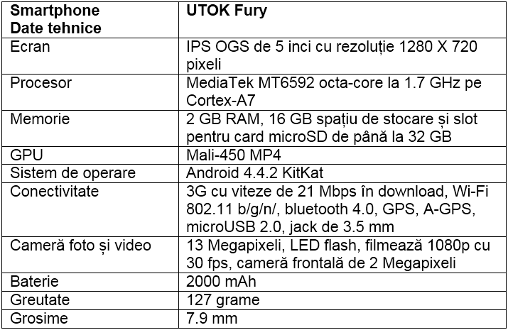 UTOK Fury este un smartphone dual-sim ce acceptă o cartelă micro-sim și una de dimensiuni normale. Vitezele maxime în 3G sunt de 21 Mbps în downlod și 5.7 Mbps în upload.