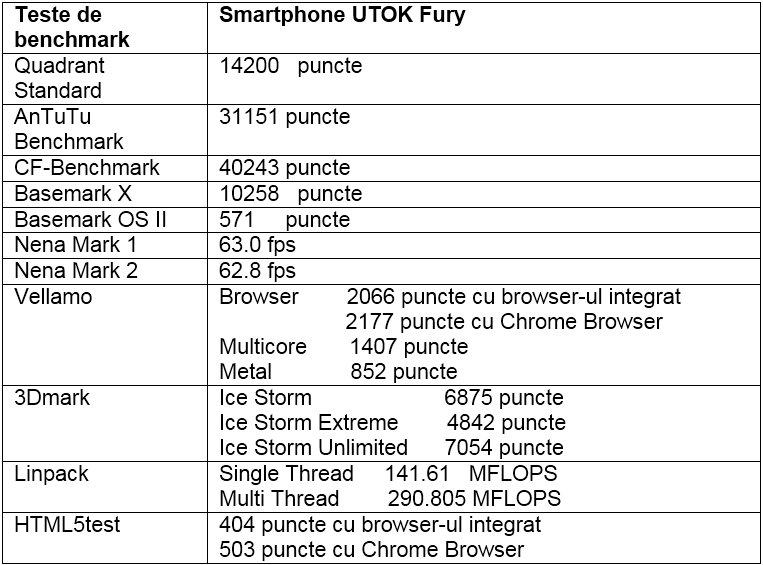 După rularea testelor de benchmark am reunit rezultatele obținute de UTOK Fury în tabelul de mai jos: