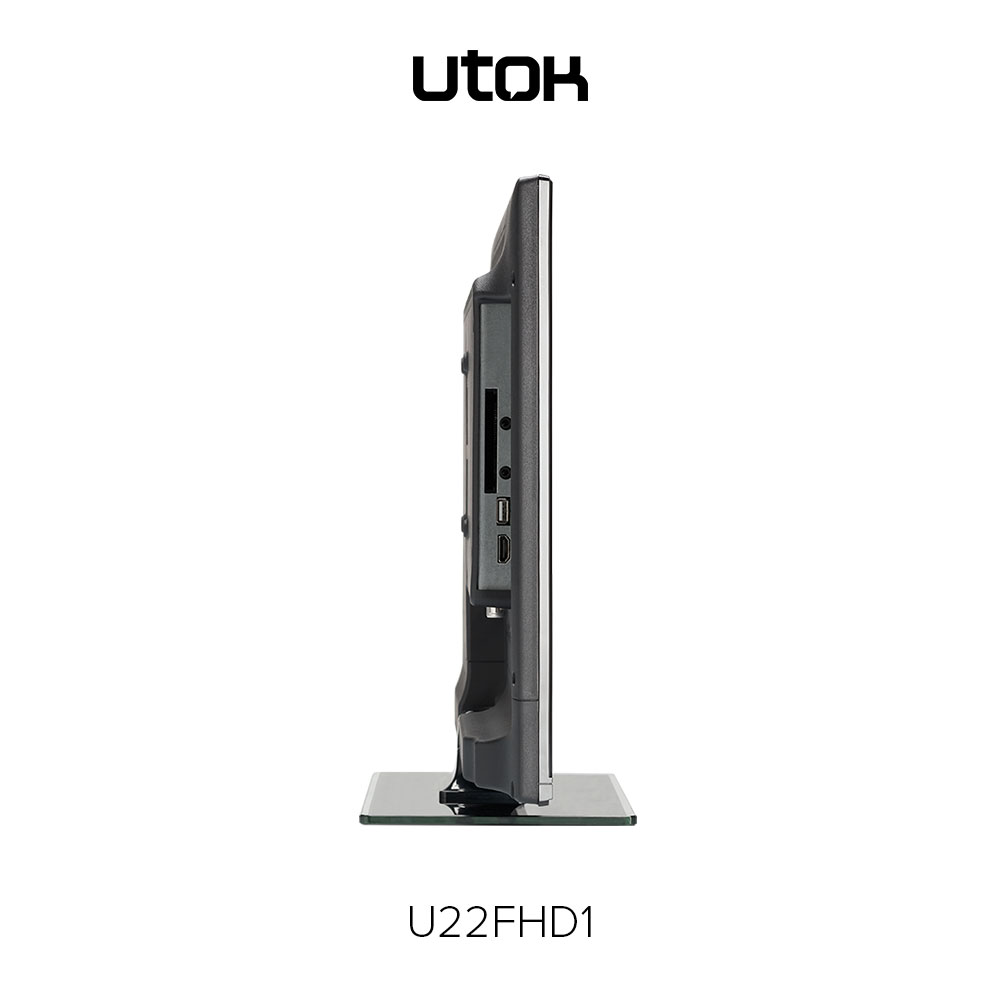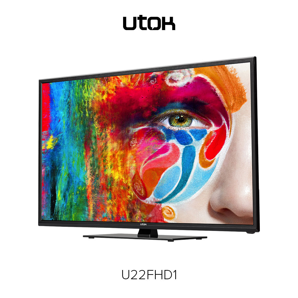 UTOK U22FHD1 – display LED cu diagonală de 21.5 inci (55 cm) şi rezoluţie FullHD (1920 x 1080 pixeli), sistem audio 3D Surround, tuner DVB-T2, elemente de conectivitate: HDMI, VGA (D-Sub), EuroSCART, Audio-In, Video Composit, USB și CI+ şi o greutate de 2.78 Kg fără stand.