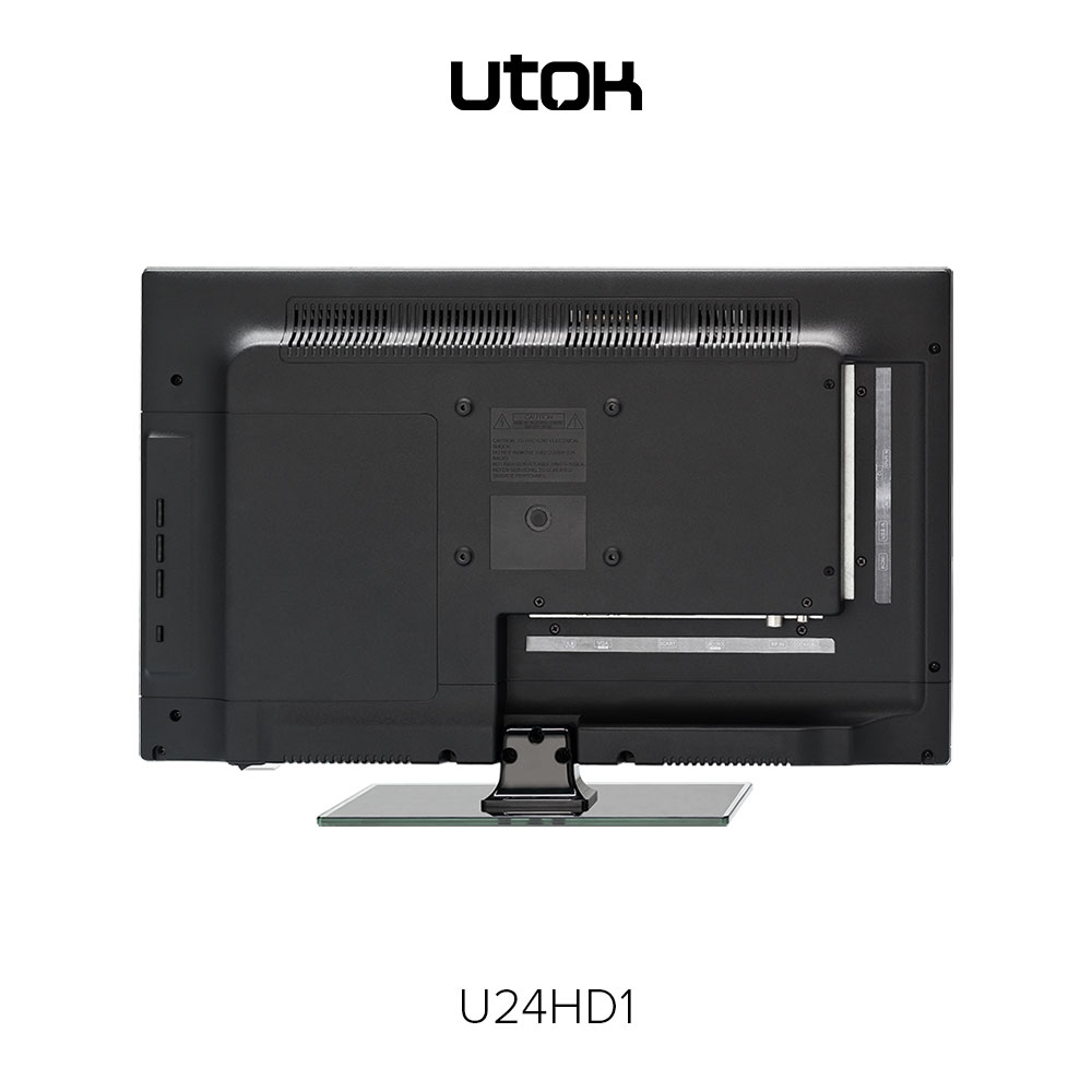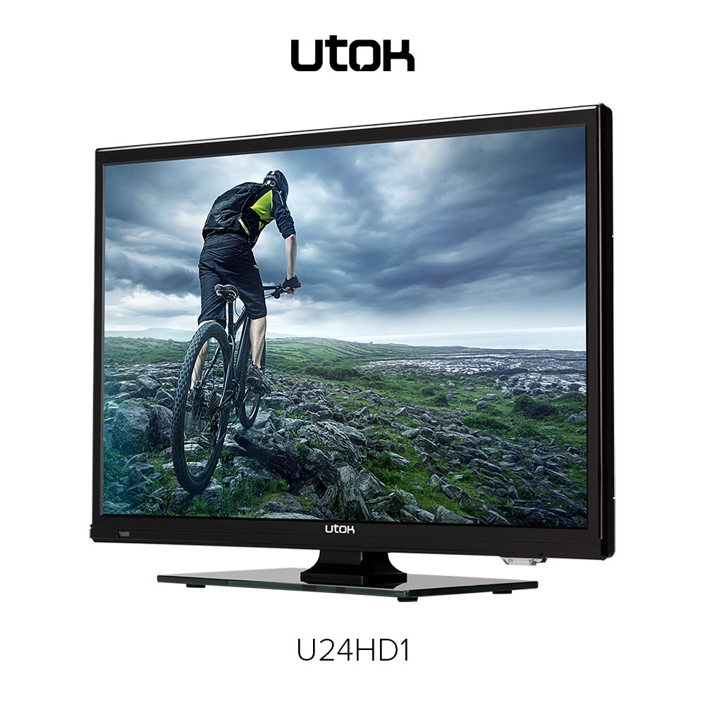 UTOK U24HD1 – display LED cu diagonală de 24 inci (60 cm) şi rezoluţie HD (1366 x 768 pixeli), sistem audio 3D Surround, tuner DVB-T2, elemente de conectivitate: HDMI, VGA (D-Sub), EuroSCART, Audio-In, Video Composit, USB și CI+ şi o greutate de 3.27 Kg fără stand.