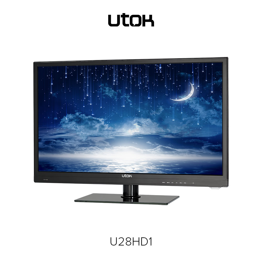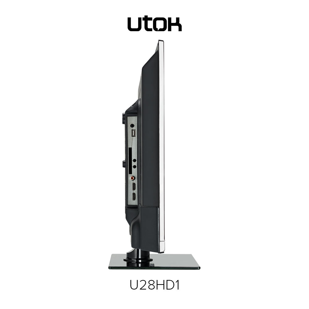 UTOK U28HD1 – display LED cu diagonală de 28 inci (70 cm) şi rezoluţie HD (1366 x 768 pixeli), sistem audio 3D Surround, tuner DVB-T2, elemente de conectivitate: HDMI, VGA (D-Sub), EuroSCART, Audio-In, Video Composit, USB și CI+ şi o greutate de 3.6 Kg fără stand.