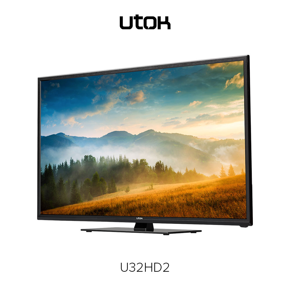 UTOK U32HD2 – display LED cu diagonală de 32 inci (81 cm) şi rezoluţie HD (1366 x 768 pixeli), sistem audio 3D Surround, tuner DVB-T2, elemente de conectivitate: HDMI, VGA (D-Sub), EuroSCART, Audio-In, Video Composit, USB și CI+ şi o greutate de 4.8 Kg fără stand.