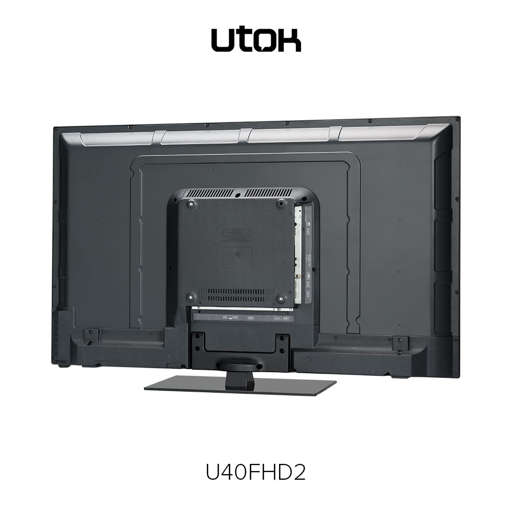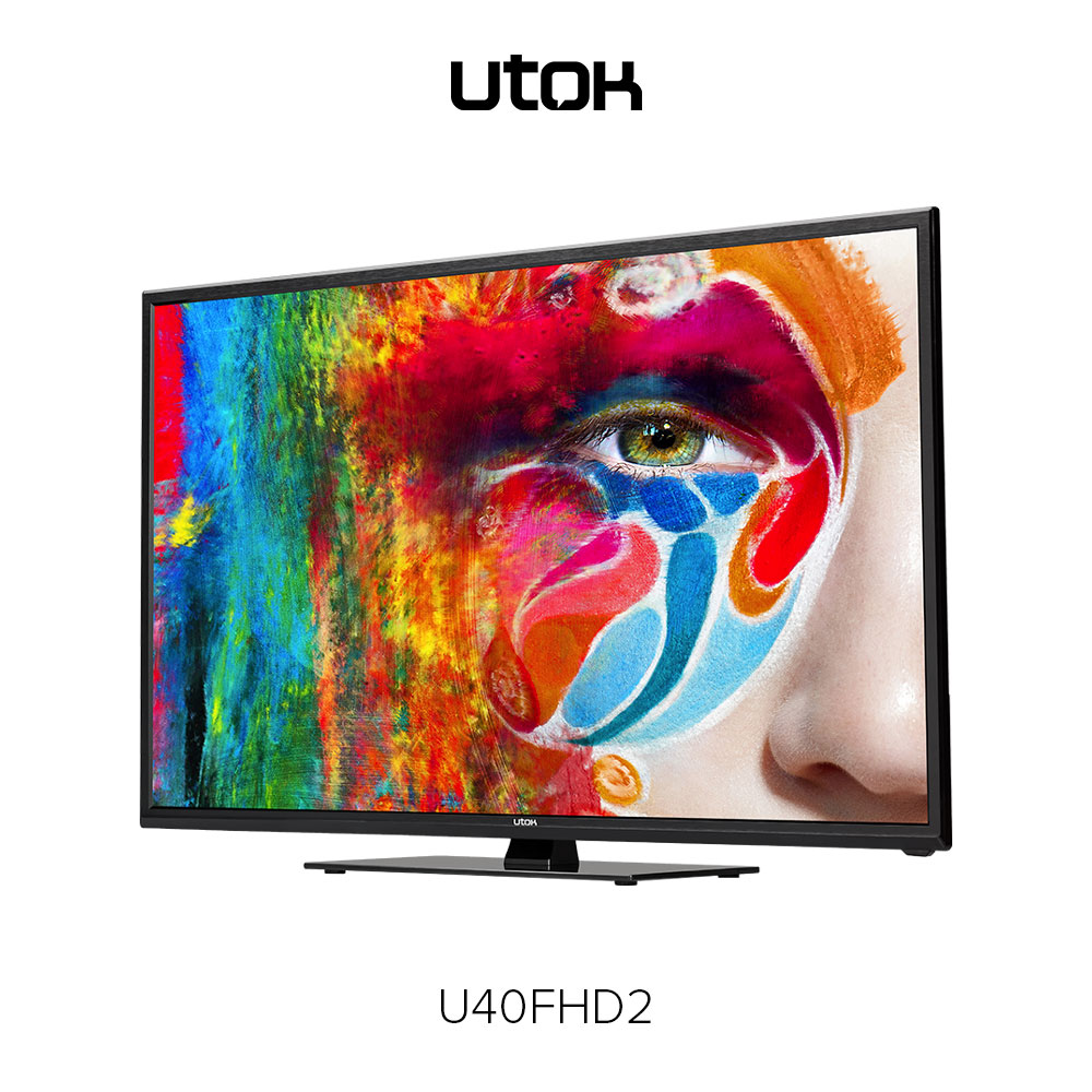 UTOK U40FHD – display LED cu diagonală de 40 inci (102 cm) şi rezoluţie FullHD (1920 x 1080 pixeli), sistem audio 3D Surround, tuner DVB-T2, elemente de conectivitate: HDMI, VGA (D-Sub), EuroSCART, Audio-In, Video Composit, USB și CI+ şi o greutate de 7.5 Kg fără stand.