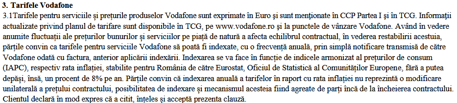 Această practică este valabilă atât la Orange, cât şi la Vodafone. La Digi Mobil nu am găsit o astfel de clauză în contract, una referitoare la indexarea anuală a preţurilor.
