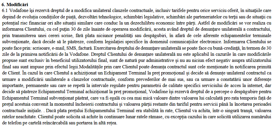 - Vodafone spune că abonatul va plăti valoarea cea mai mică dintre: valoarea terminalului calculată pro-rata temporis faţă de preţul acestuia convenit la momentul încheierii contractului şi valoarea părţii restante din tariful pentru servicii până la încetarea perioadei contractuale iniţiale;