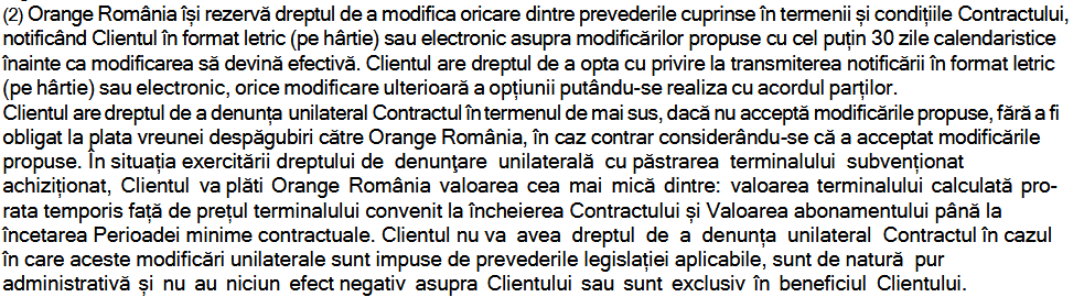 - Orange spune că abonatul va plăti valoarea cea mai mică dintre: valoarea terminalului calculată pro-rata temporis faţă de preţul terminalului convenit la încheierea contractului şi valoarea abonamentului până la încetarea perioadei minime contractuale;