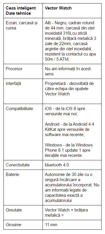 Nu am informații legate de hardware-ul propriu-zis, CPU, GPU, memorie RAM, spațiu de stocare etc. Știu doar că Vector Watch folosește o soluție hardware pliată la maxim pe ceea ce și-au propus a atinge cu acest ceas inteligent.
