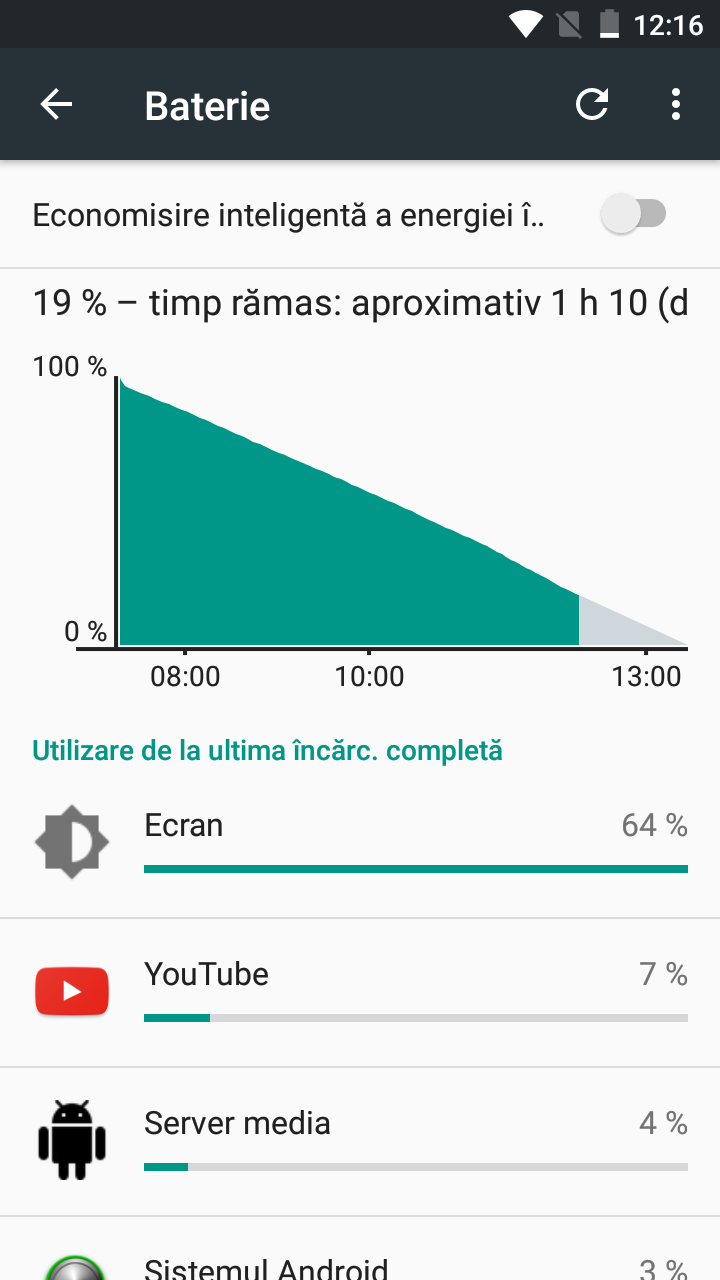 În testul de autonomie al Gadget.ro a coborât de la 100% la 20% în 5 ore. Trece de pragul a 6 ore în redarea unui playlist de pe YouTube pe conexiune Wi-Fi. Este o valoare decentă pentru un acumulator de 2800 mAh.