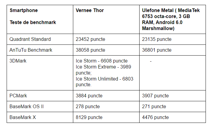 Rezultatele obținute de Vernee Thor în testele de benchmark uzuale pentru site-ul nostru, compilate în tabel.