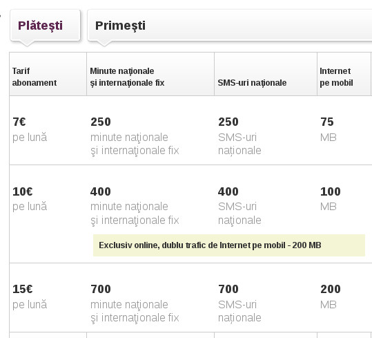 Noile abonamente se numesc Mega Naţional 7, 10 şi 15 în valoare de 7,10 şi respective 15 euro. La abonamentul de 7 euro veţi primi 250 minute naţionale şi internaţionale către fix, 250 sms-uri naţionale şi 75 MB internet pe mobil. La abonamentul de 10 euro veţi primi 400 minute naţionale şi internaţionale către fix, 400 sms-uri naţionale şi 100 MB internet pe mobil, iar la abonamentul de 15 euro veţi primi 700 minute naţionale şi internaţionale către fix, 700 sms-uri naţionale şi 200 MB internet pe mobil.