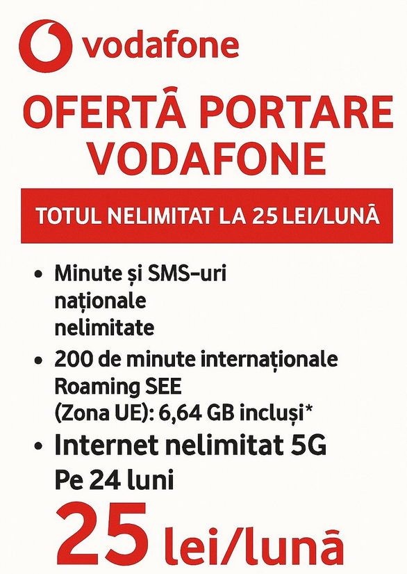Vodafone încearcă să atragă abonaţi noi pe telefonie mobilă şi iese în piaţă la portare cu un abonament ce oferă totul NELIMITAT la doar 25 lei / lună