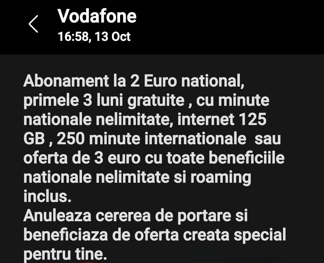 Vodafone încearcă să îşi convingă abonaţii să renunţe la cererea de portare cu oferte extraordinare (exemplu: 2 euro / lună cu 125 GB internet mobile şi primele 3 luni gratuite)