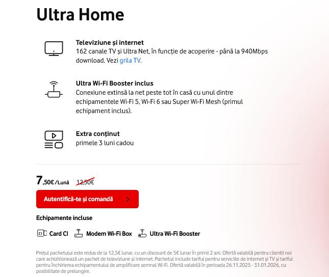 Vodafone şi-a actualizat portofoliul de pachete de internet fix şi televiziune, astfel că acum avem două noi opţiuni: Vodafone Ultra Home şi Ultra Home+.