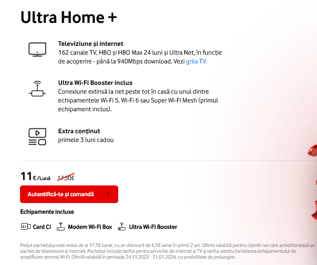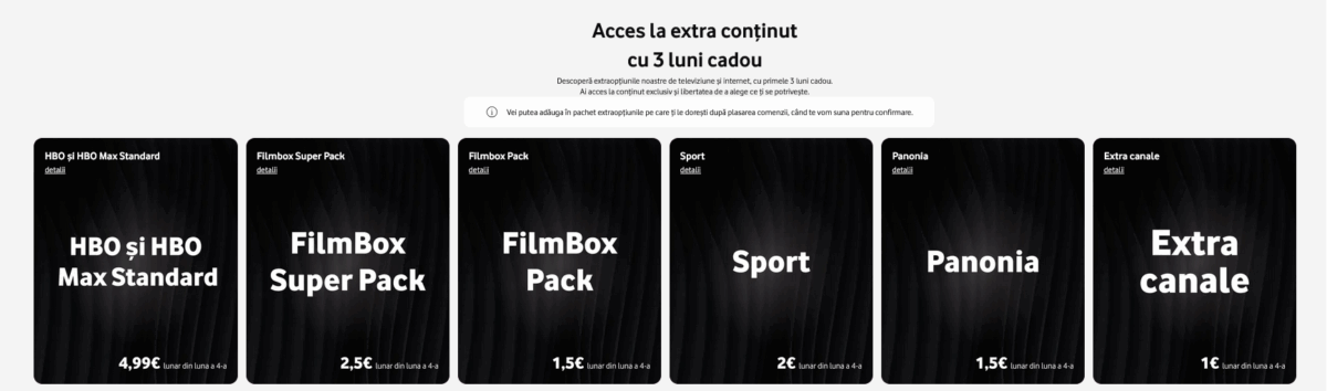- BONUS: Extra conținut – primele 3 luni cadou (Sport, HBO și HBO Max Standard fără publicitate, Panonia, FilmBox Pack, FilmBox Super Pack, Extra Canale).