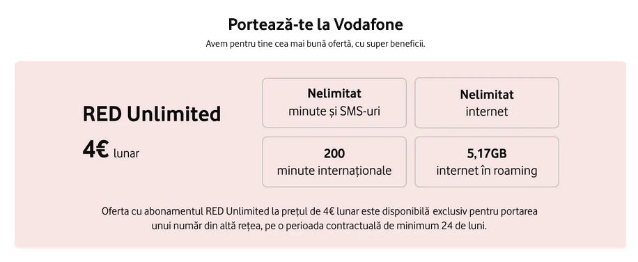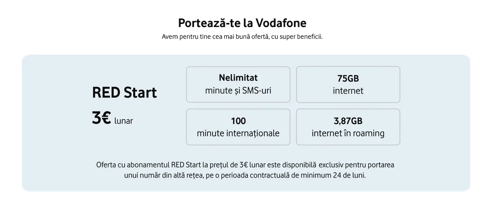 Cei care aleg să porteze un număr în reţeaua Vodafone, pot aplica pentru abonament RED Start la un preţ de doar 3 euro / lună pe toată perioada contractuală de 24 luni. În aceşti bani primiţi: